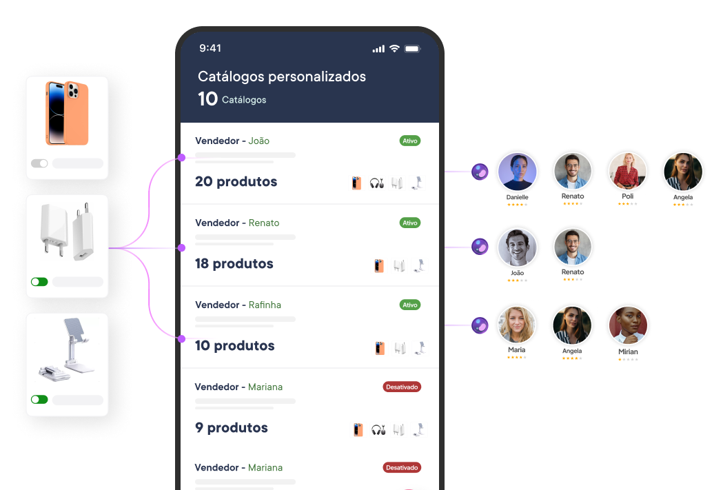 Crie catálogos exclusivos para cada vendedor, dando independência para sua equipe e controle total para o distribuidor.